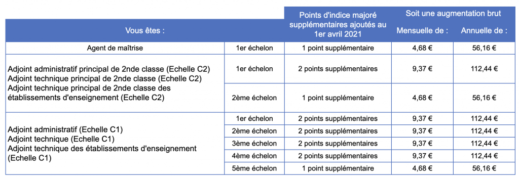 - 1 point d’indice majoré pour les agents situés aux indices bruts 359 à 361.