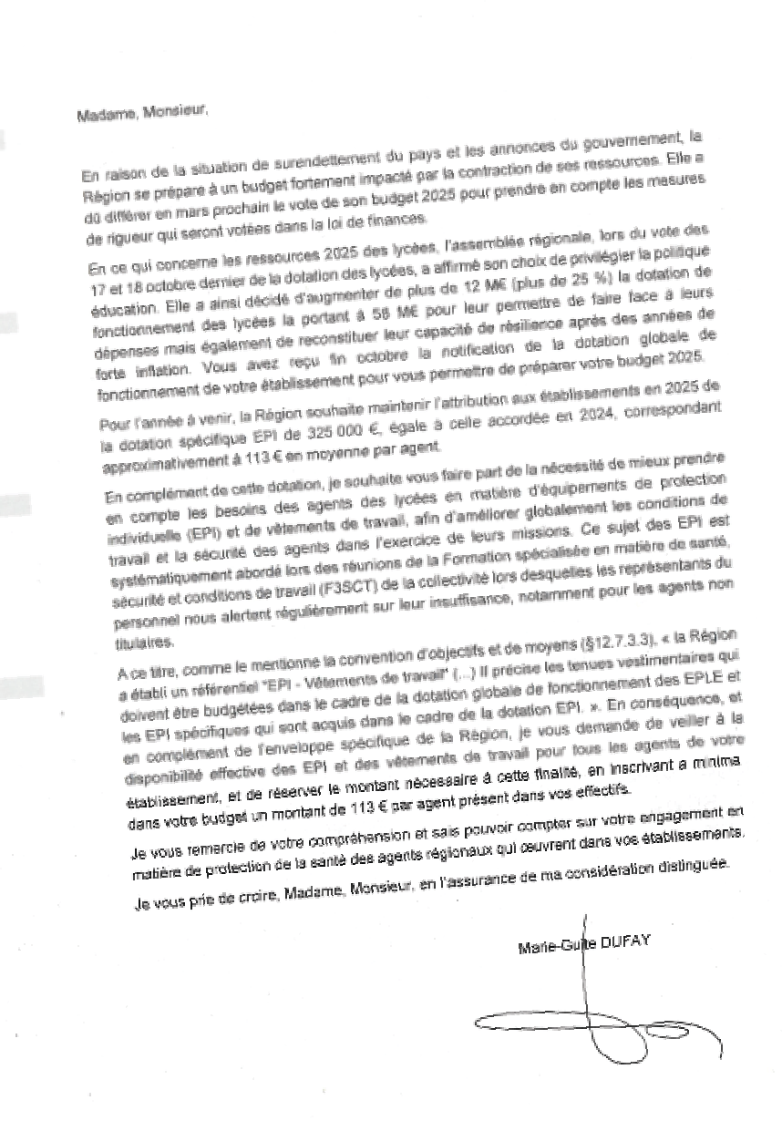 Concrètement, le 29 novembre 2024, un courrier a été envoyé aux chefs d’établissement des EPLE, leur demandant de prévoir impérativement et au minimum 113 € par an et par agent pour les EPI et les vêtements de travail dans le budget de l’établissement.