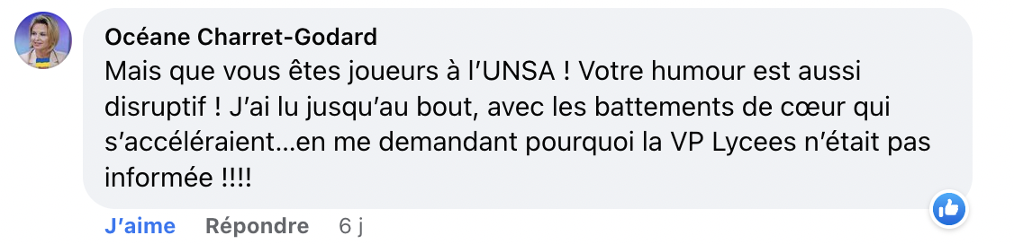 Voilà, le prank UNSA du 1er avril 2022 a terriblement bien fonctionné cette année ! Bonne rigolade collective ! Alors, on me signale que les notifications de cet article arrivent encore dans les boîtes emails des abonnés à la newsletter UNSA (impossible de savoir pourquoi, un email envoyé le 1er avril arrive le 8 avril chez certains collègues), du coup, même si c’est évident, obligé de préciser que cet article n’est qu’une pure fiction ! Un prank qui a d’ailleurs dépassé sa cible initiale (les collègues du Conseil régional) : mention spéciale à notre Vice-Présidente aux lycées dont je vous laisse découvrir la réaction pleine d’humour, ça fait du bien aussi des « élus politiques », « nos patrons », avec qui on peut sourire et même rire de temps en temps.