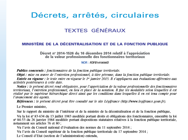 Décret n° 2014-1526 du 16 décembre 2014 relatif à l’appréciation de la valeur professionnelle des fonctionnaires territoriaux