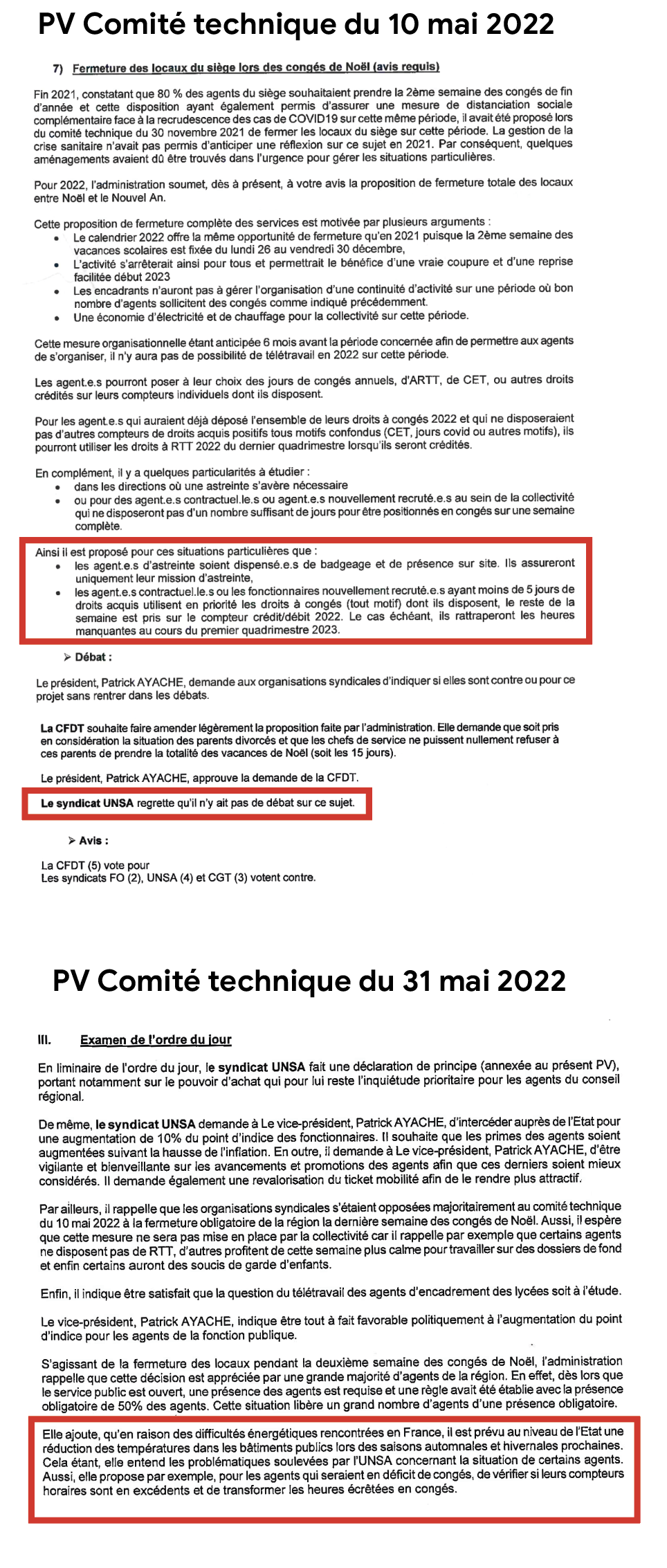 Dans le cadre de la fermeture des locaux des sièges en décembre, l’UNSA avait obtenu du VP RH Patrick Ayache que les agents en déficit de congés, puissent utiliser leurs compteurs horaires qui sont en excédents et de transformer les heures écrêtées de l’année en congés.