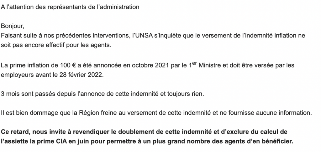 L’UNSA a constaté comme vous que l’indemnité inflation n’avait toujours pas été versé aux agents du Conseil régional.