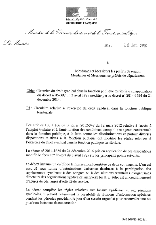 La circulaire du 20 janvier 2016 relative à l’exercice du droit syndical dans la fonction publique territoriale est publiée.