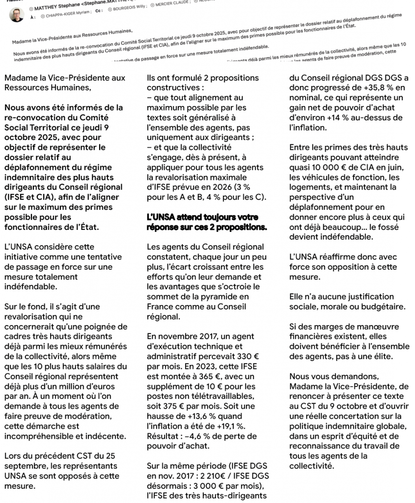 Ce jeudi 9 octobre, la VP RH Myriam CHIAPPA KIGER a re-convoqué le CST pour tenter de faire repasser un dossier rejeté par l’UNSA le 25 septembre : la hausse des primes des plus hauts dirigeants du Conseil régional.