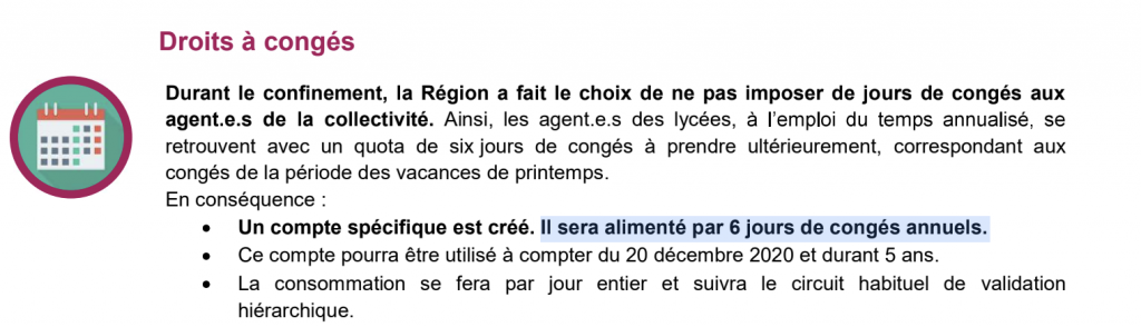 Il s’agit d’un compte spécifique Covid alimenté de 6 jours utilisables à partir du 20 décembre 2020 et durant 5 ans. Les jours qui ne seraient pas consommés le 21 décembre 2025, pour quel motif que ce soit, seront perdus.