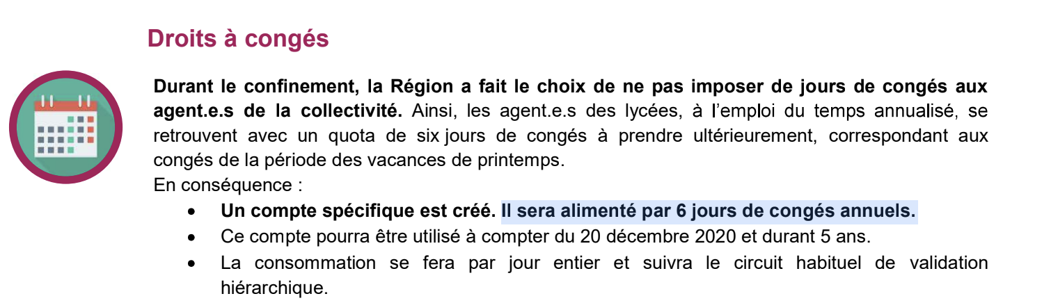 Il s’agit d’un compte spécifique Covid alimenté de 6 jours utilisables à partir du 20 décembre 2020 et durant 5 ans. Les jours qui ne seraient pas consommés le 21 décembre 2025, pour quel motif que ce soit, seront perdus.