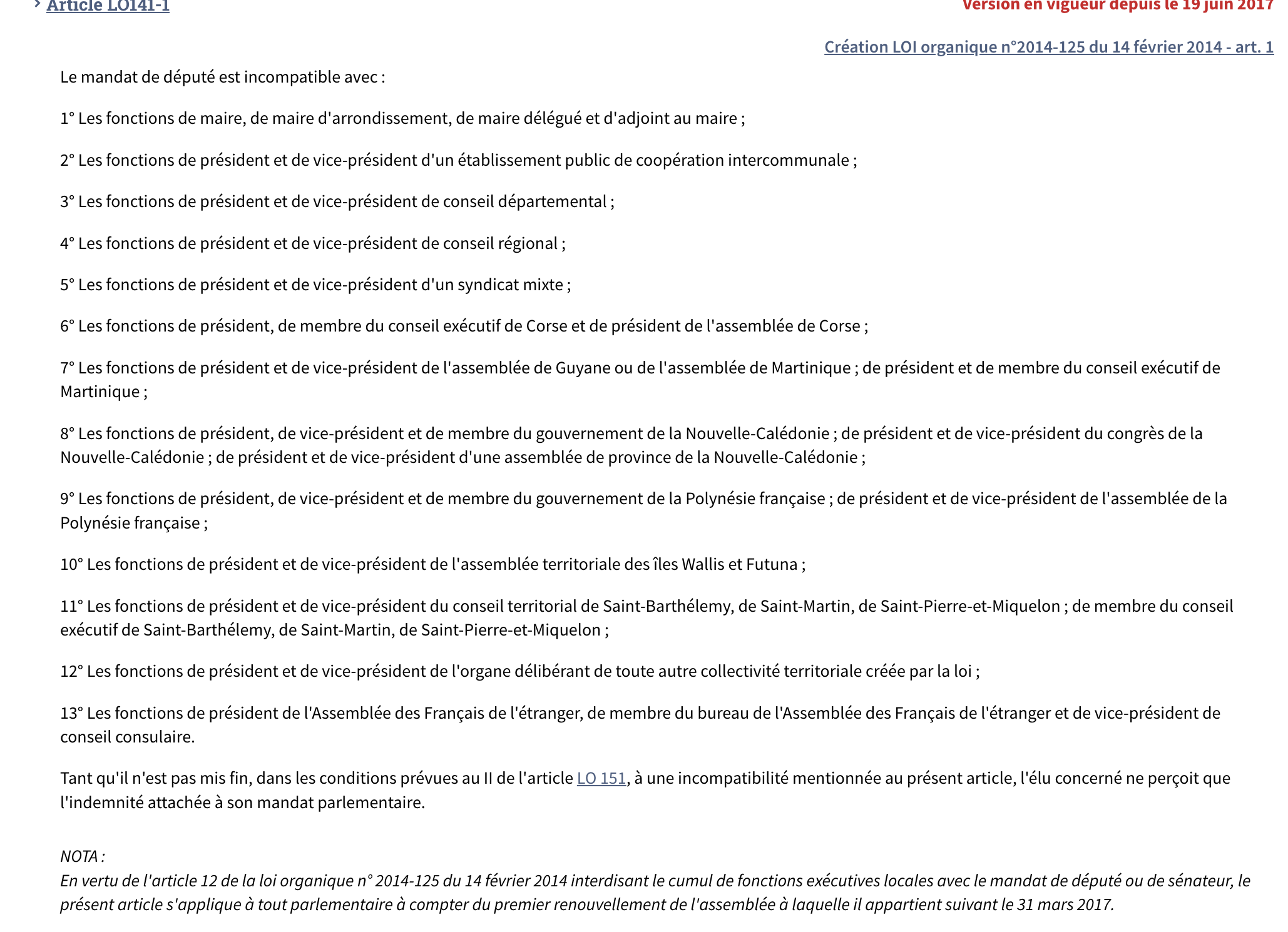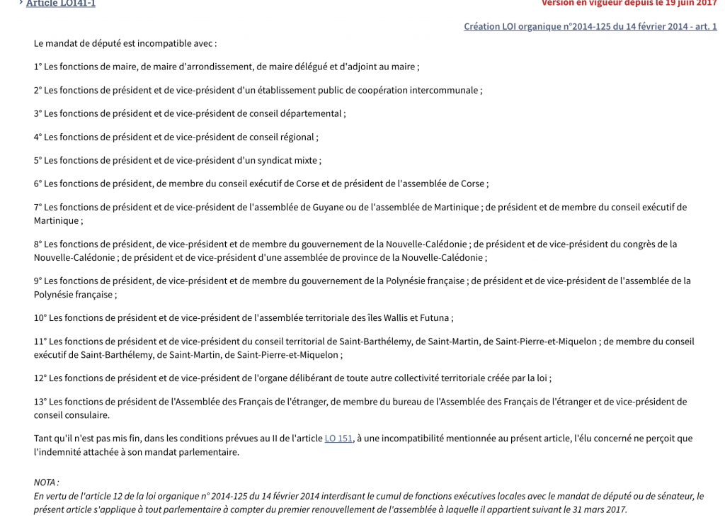 Et oui, les parlementaires nationaux ont des possibilités restreintes quant au cumul de plusieurs mandats électoraux. Il est interdit à tout député et sénateur d’exercer une fonction exécutive locale.