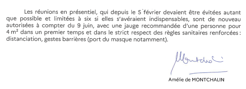 A compter du 9 juin, ces réunions regroupant plus de 6 personnes pourront se tenir en présence dans le strict respect des consignes sanitaires (port du masque, respect de la distanciation et des gestes barrières). Toutefois il est recommandé d’appliquer une jauge d’une personne pour 4m².
