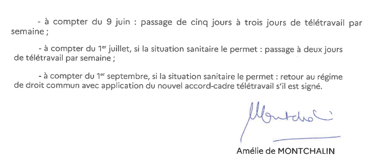- à compter du 9 juin 2021 : 3 jours de télétravail par semaine (au lieu de 5 jours) ;