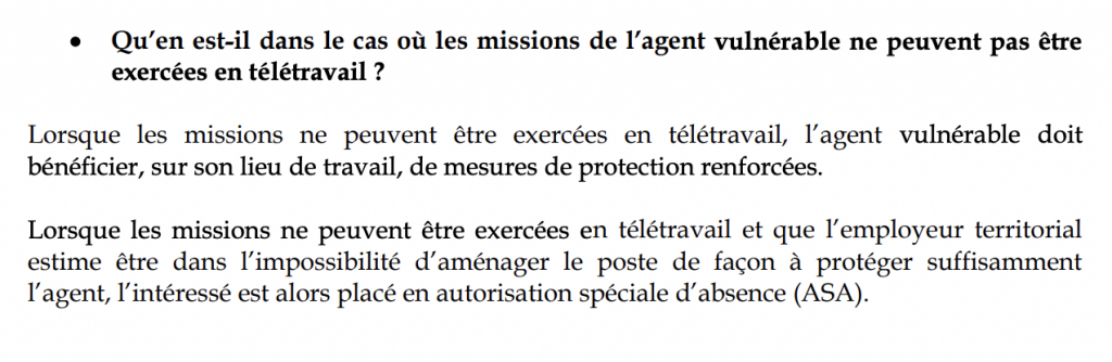 Lorsque leurs missions ne peuvent pas être exercées en télétravail et pour les agents devant assurer la garde de leurs enfants de moins de 16 ans (limite d’âge ne s’appliquant pas pour les agents dont les enfants sont en situation de handicap) au regard de la fermeture temporaire des crèches et des établissements scolaires, il est demandé aux employeurs de les placer en autorisation spéciale d’absence (ASA).