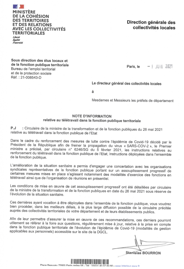 - du Ministère de la Fonction Publique (le calendrier du retour sur le lieu de travail pour les agents de la Fonction publique est précisé dans une circulaire publiée le mercredi 26 mai 2021)
