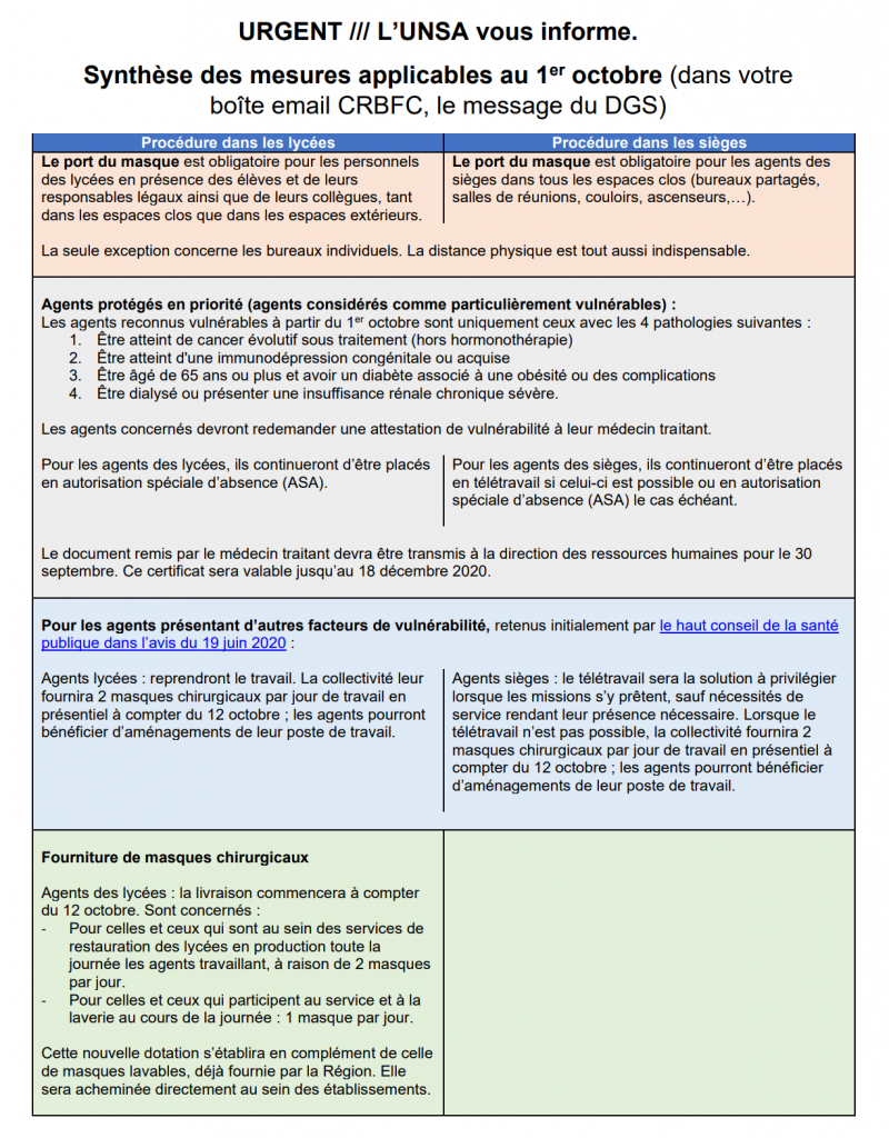 UNSA ➡ Agents vulnérables attention des nouvelles mesures sont applicables au 1er octobre