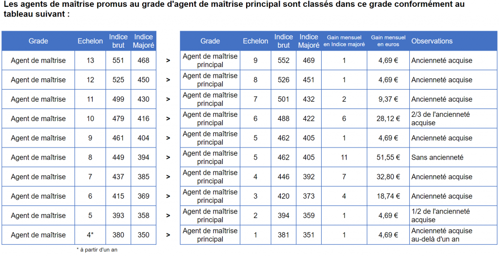 CAP du 1er octobre : vous êtes agent de maîtrise et vous venez d’avoir un avancement de grade à agent de maîtrise principal ? L’UNSA donne les modalités de reclassement dans votre nouveau grade et vous explique combien vous allez obtenir en plus chaque mois (montants bruts) !