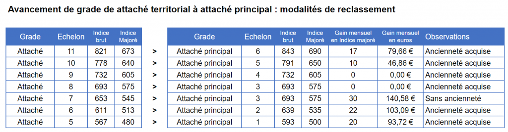 CAP du 1er octobre : vous êtes attaché territorial et vous venez d’avoir un avancement de grade à attaché principal ? L’UNSA donne les modalités de reclassement dans votre nouveau grade et vous explique combien vous allez obtenir en plus chaque mois (montants bruts) !