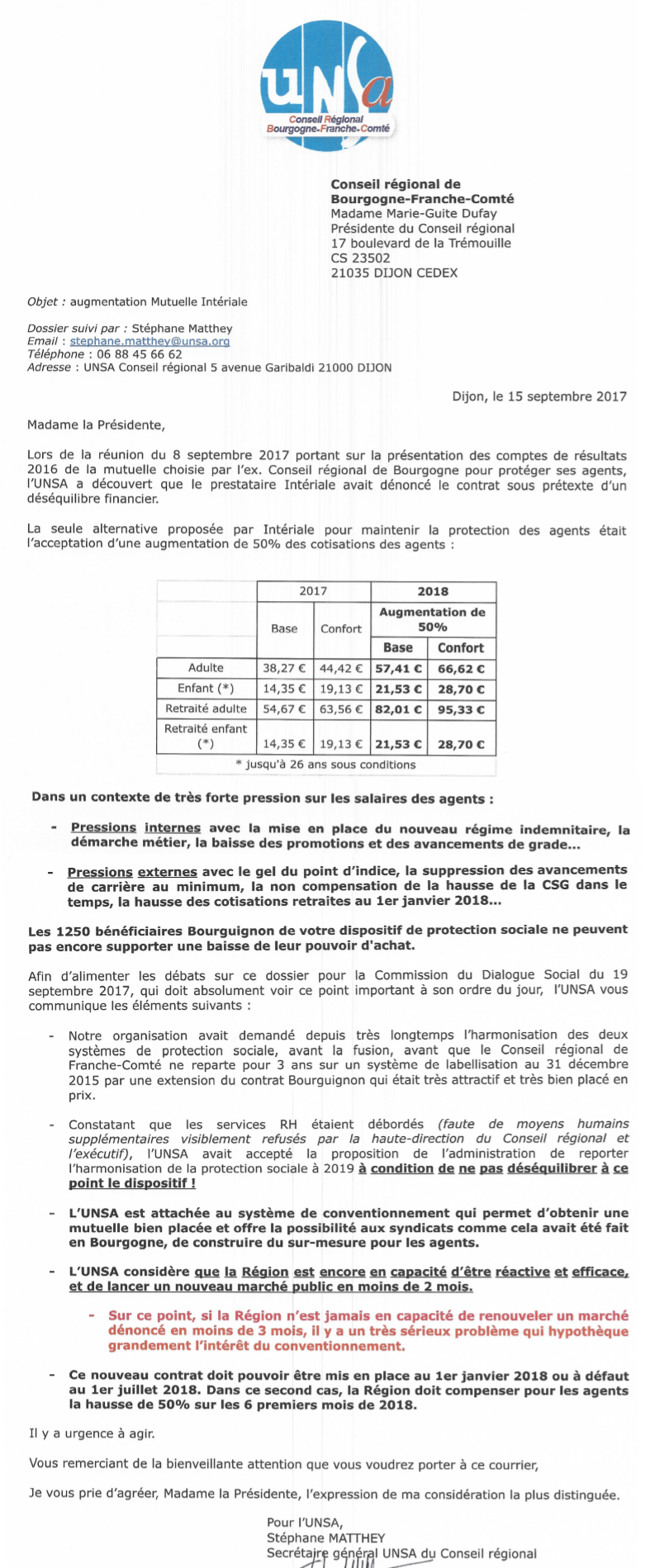 [UNSA] Courrier de l’UNSA sur la proposition d’augmentation de 50% de la mutuelle des agents bourguignons