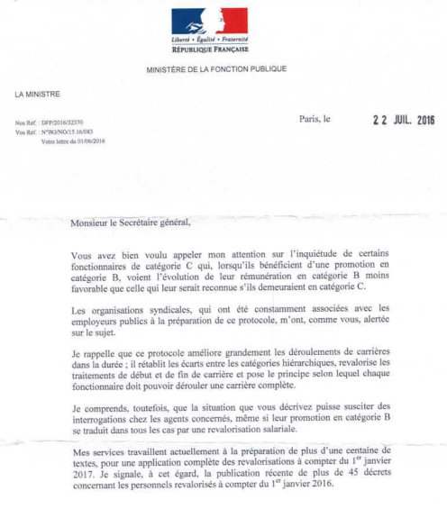 Page1LettreMinistreL’UNSA avait alerté la ministre de la fonction publique sur l’inquiétude de certains fonctionnaires de catégorie C qui, lorsqu’ils bénéficient d’une promotion en catégorie B, peuvent voir l’évolution de leur rémunération en catégorie B moins favorable que celle qui leur serait reconnue s’ils demeuraient en catégorie C.
