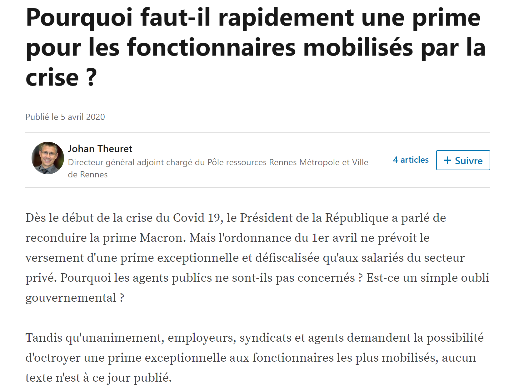 Cet oubli et les querelles juridiques qui y sont liées constituent de mauvais signaux adressés à celles et ceux qui assurent la continuité du service dans le contexte anxiogène de la crise actuelle. En effet, les fonctionnaires les plus impliqués au quotidien, mobilisés sur le terrain pour assurer les services essentiels, engagés au service des plus vulnérables, doivent bénéficier d’une telle prime. Les modalités d’octroi et les périmètres des agents concernés seront les débats de demain. L’urgence aujourd’hui, c’est la reconnaissance. Or la reconnaissance dépasse les discours et se témoigne par des symboles, ceux qui reconnaissent que les services publics essentiels ont été maintenus sur l’ensemble du territoire grâce à la forte mobilisation des agents publics.