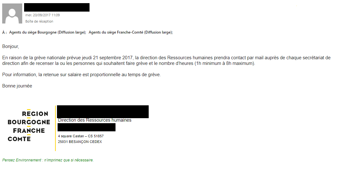 Vous n’avez pas à remplir par anticipation un tableau, une liste pour faire en sorte que la grève soit la moins pénalisante possible… La DRH centralisera toute la journée le nombre de grévistes qui sera constaté par votre supérieur hiérarchique. Vous mettrez à jour votre logiciel de gestion du temps de travail en déclarant le nombre d’heure de grève.
