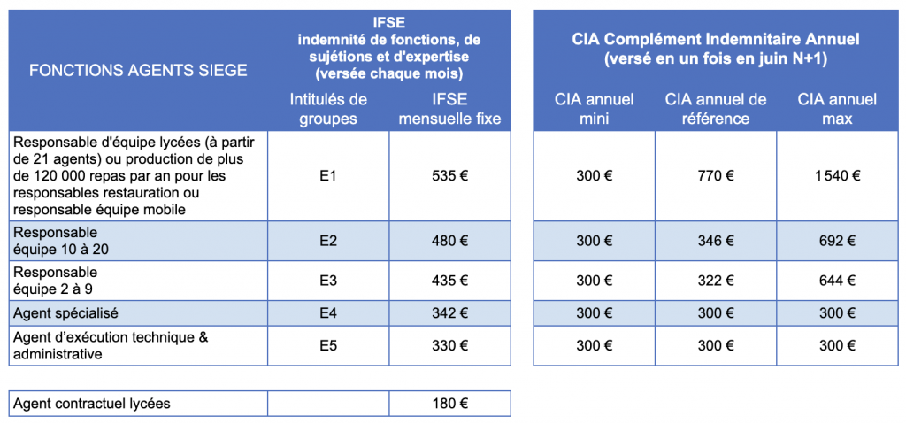 Suite à l’action de l’UNSA pour obtenir la revalorisation des primes au même titre que le point d’indice, voici le tableau des primes au Conseil régional pour les agents des sièges. Prime IFSE Socle 1 Intitulés de groupes IFSE mensuelle fixe DG/DGA SA1 2 287 € Directeur SA2 1 496 € Directeur Adjoint SA3 1 144 € Chef…