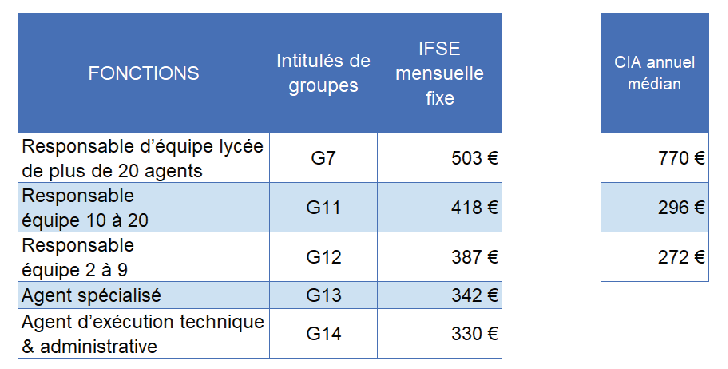 Le RIFSEEP est un nouveau système de prime pour les agents (régime indemnitaire tenant compte des fonctions, des sujétions, de l’expertise et de l’engagement professionnel : RIFSEEP). Ce régime indemnitaire est composé de deux primes : une indemnité de fonctions, de sujétions et d’expertise (IFSE), versée chaque mois et un complément indemnitaire annuel (CIA) versé en une fois au Conseil régional et non reconductible automatiquement car il dépend du mérite de l’agent.