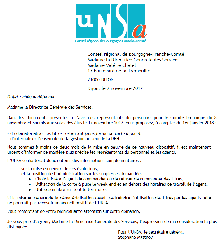 [UNSA] Titre restaurant l’UNSa demande à l’administration des informations