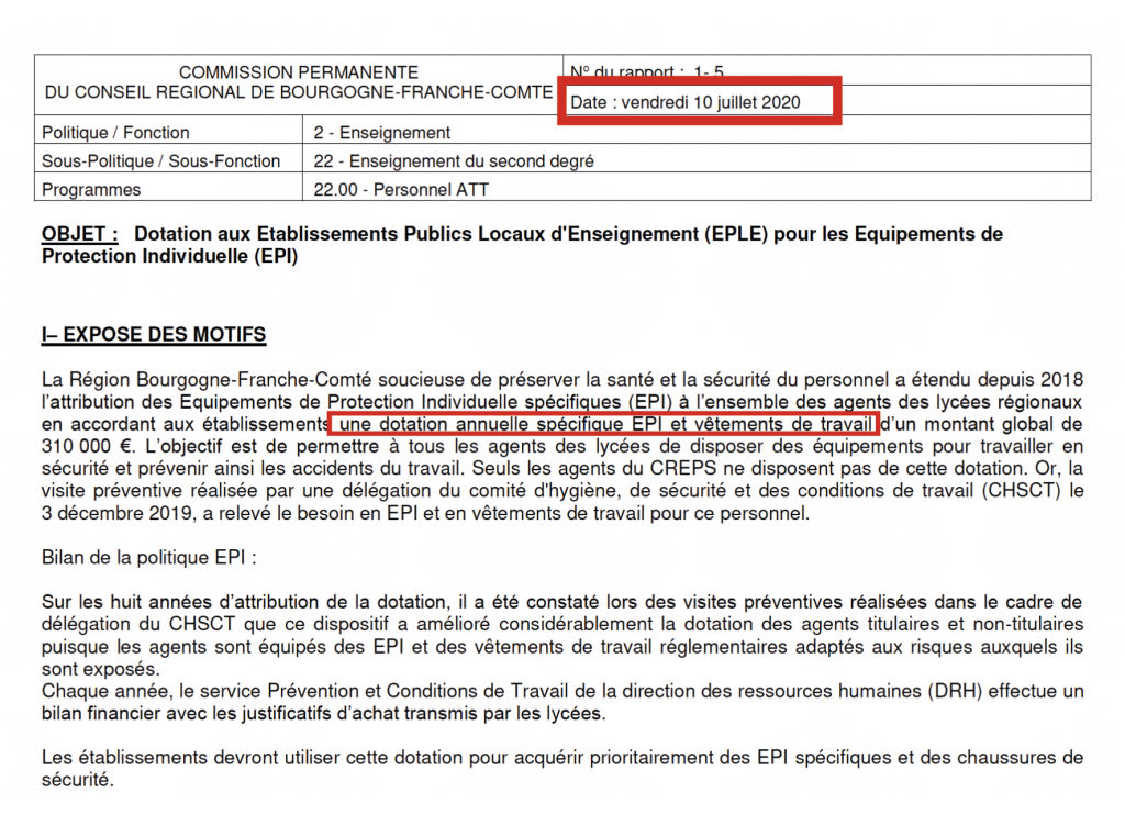 Cette situation a évolué à la suite de la Commission Permanente du 10 juillet 2020, qui a décidé d’élargir l’utilisation de la dotation annuelle pour l’année scolaire 2020-2021 afin d’inclure non seulement les EPI mais aussi les vêtements de travail.