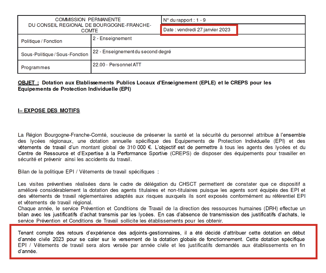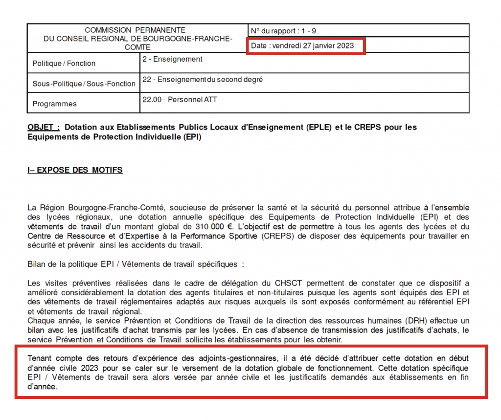 Autre évolution en Commission Permanente des élus du Conseil régional du 27 janvier 2023, la transition de la gestion des dotations « EPI & vêtements de travail » de l’année scolaire vers l’année civile (changement pour l’exercice 2021-2022). Initialement calibrée sur l’année scolaire, la période de couverture de la dotation s’étendait du 1er septembre au 31 août. Avec cette nouvelle modification, la période couverte a été exceptionnellement allongée pour englober les mois allant du 1er septembre 2021 jusqu’au 31 décembre 2022.