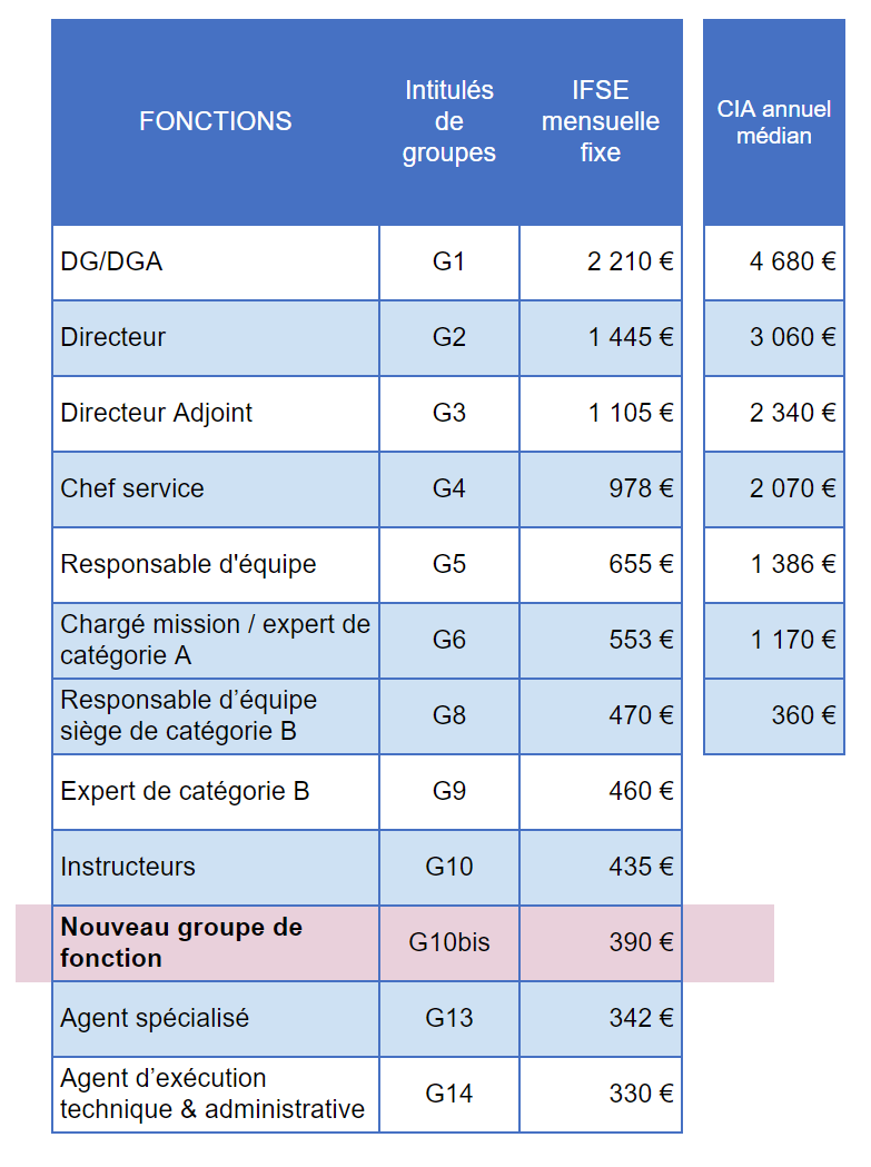 L’administration, sur demande de la Présidente du Conseil régional lors du Comité technique du 5 novembre, a proposé au Comité technique du 21 novembre créer un groupe supplémentaire G 10 bis dont le montant d’IFSE serait de 390 € brut mensuel.